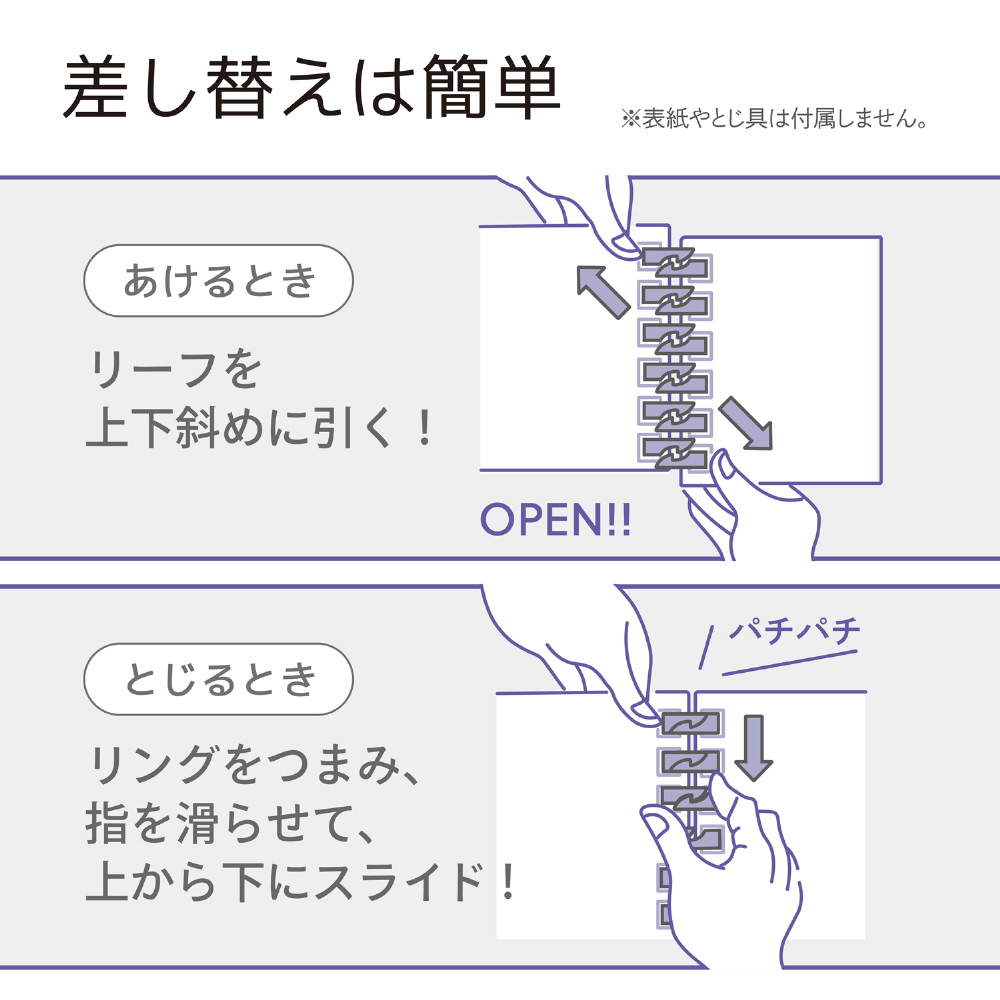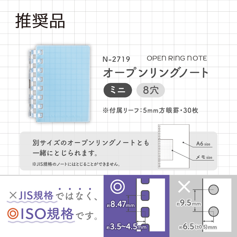 オープンリングノート ミニ N2719の交換用<適合リーフ>となっています。オープンリングノートは、とじ具を開いてリーフを交換することで繰り返し使用することが可能です。