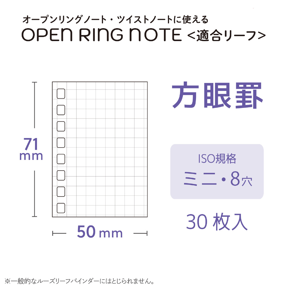 リングを開いて、リーフの抜き差し・交換ができるオープンリングノート専用のミニサイズの方眼罫リーフです。