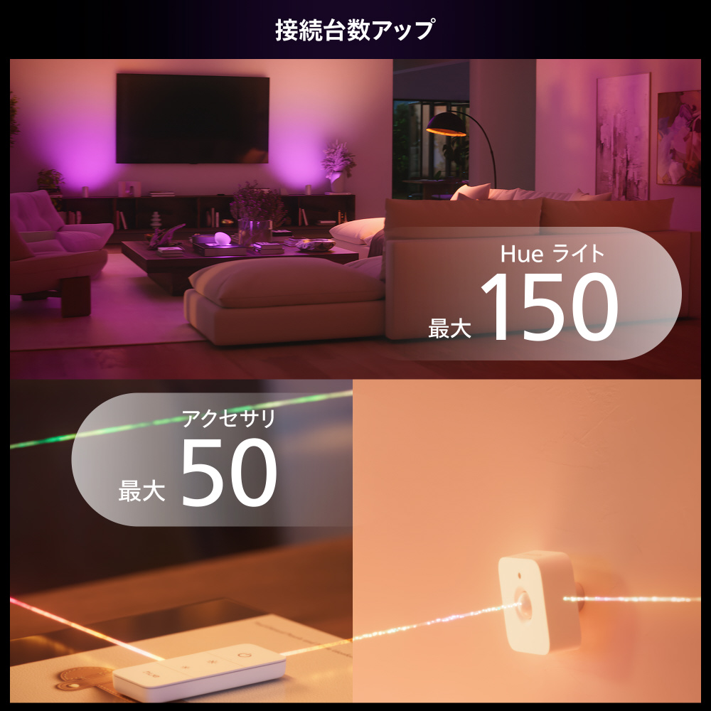 従来のHue ブリッジから5倍の速度、15倍の大容量メモリを搭載し、Hueライトを人感センサーとして利用できる「MotionAware?(モーションアウェア)」機能が登場。接続台数は150個のHue ライトと50個のアクセサリーへと拡大。接続方法も従来のLANケーブル接続に加え、Wi-Fi接続(LANケーブル不要)も加わり、設置場所の柔軟性が高まりました。不正アクセスを防止するセキュリティ保護が強化するなど、数々のアップグレードが盛り込まれています。