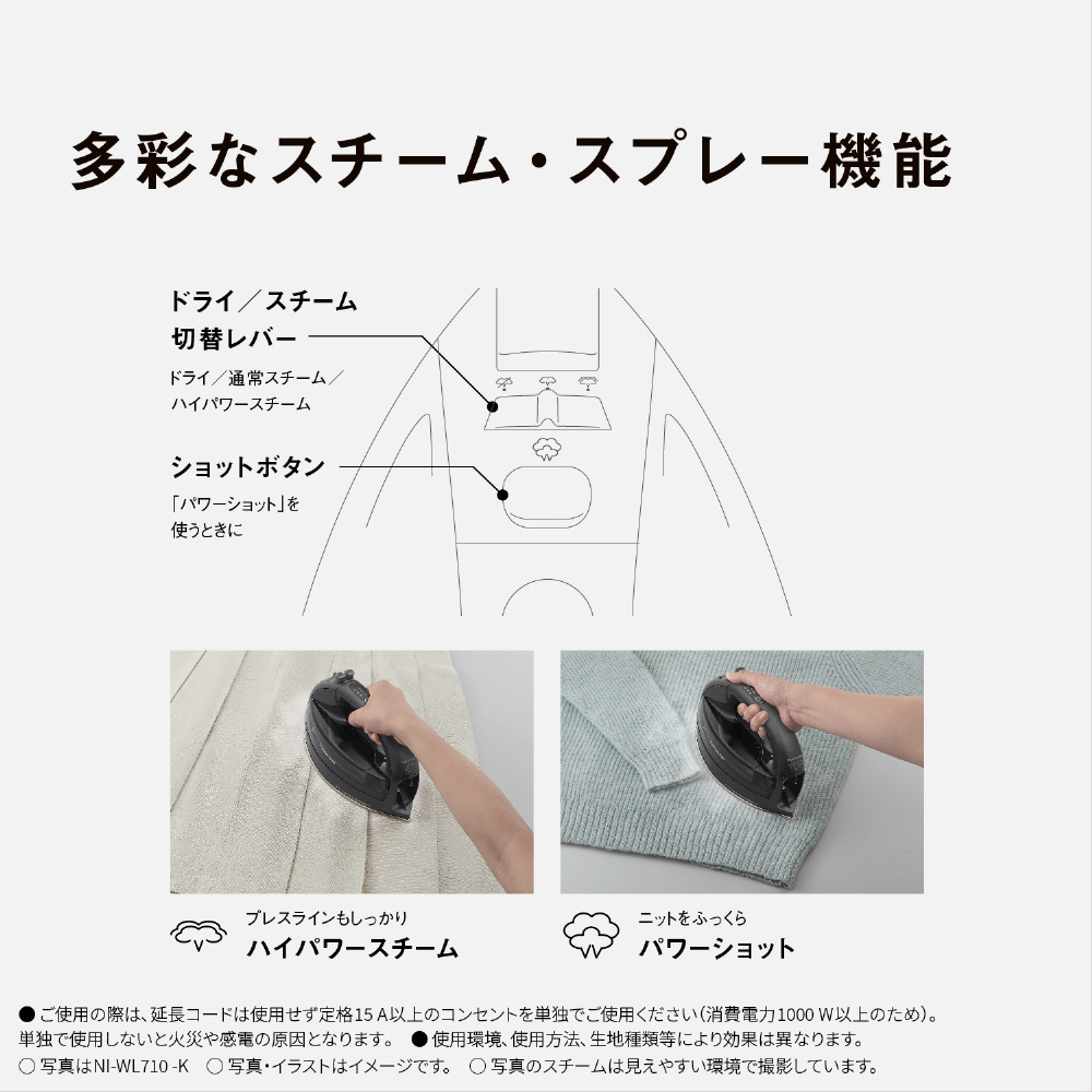 最大約15g/分のパワフルなスチームがアイロン面全体から噴射。パワーショットも搭載し手早くシワのばし。