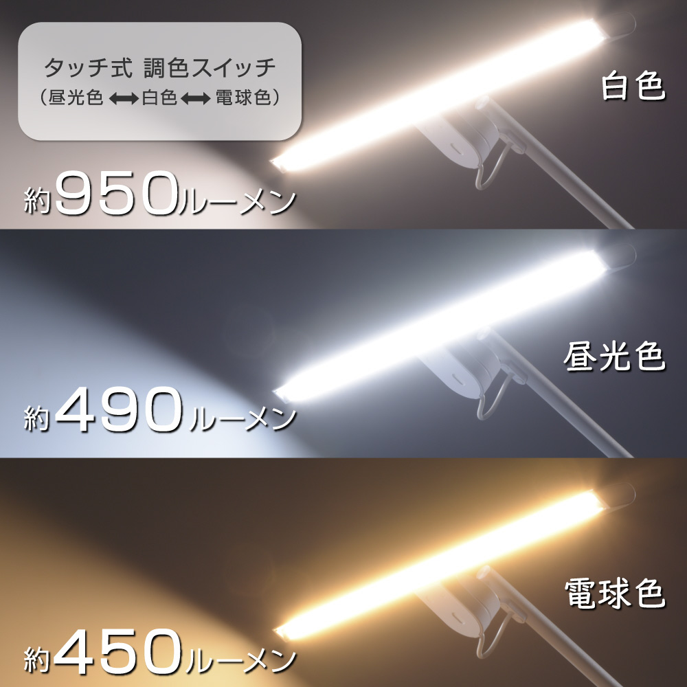 明るさ 白色…約950ルーメン(100%点灯時/約4200K)、電球色…約450ルーメン(100%点灯時/約2700K)、昼光色…約490ルーメン(100%点灯時/約6500K)