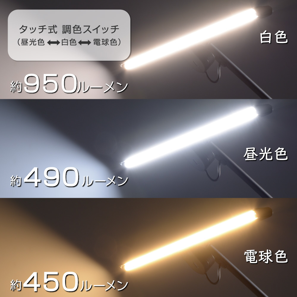 明るさ 白色…約950ルーメン(100%点灯時/約4200K)、電球色…約450ルーメン(100%点灯時/約2700K)、昼光色…約490ルーメン(100%点灯時/約6500K)