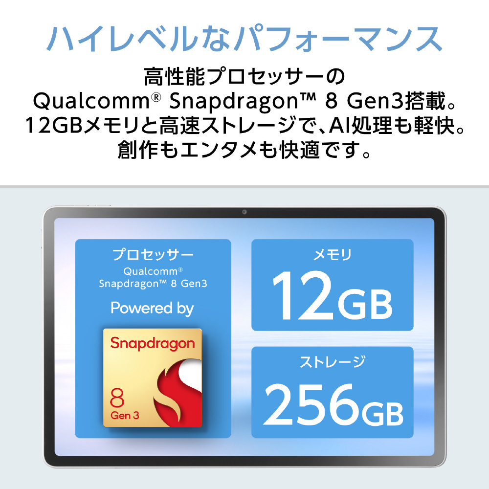 優れたマルチタスク性能やグラフィック性能を発揮し、NPU(AI処理に特化したプロセッサー)も搭載した、Snapdragon 8 Gen 3(6コア)を採用。日常的な操作から、負荷の高いマルチタスク、画像や動画の編集、AI処理、ゲームまで快適に行えます。