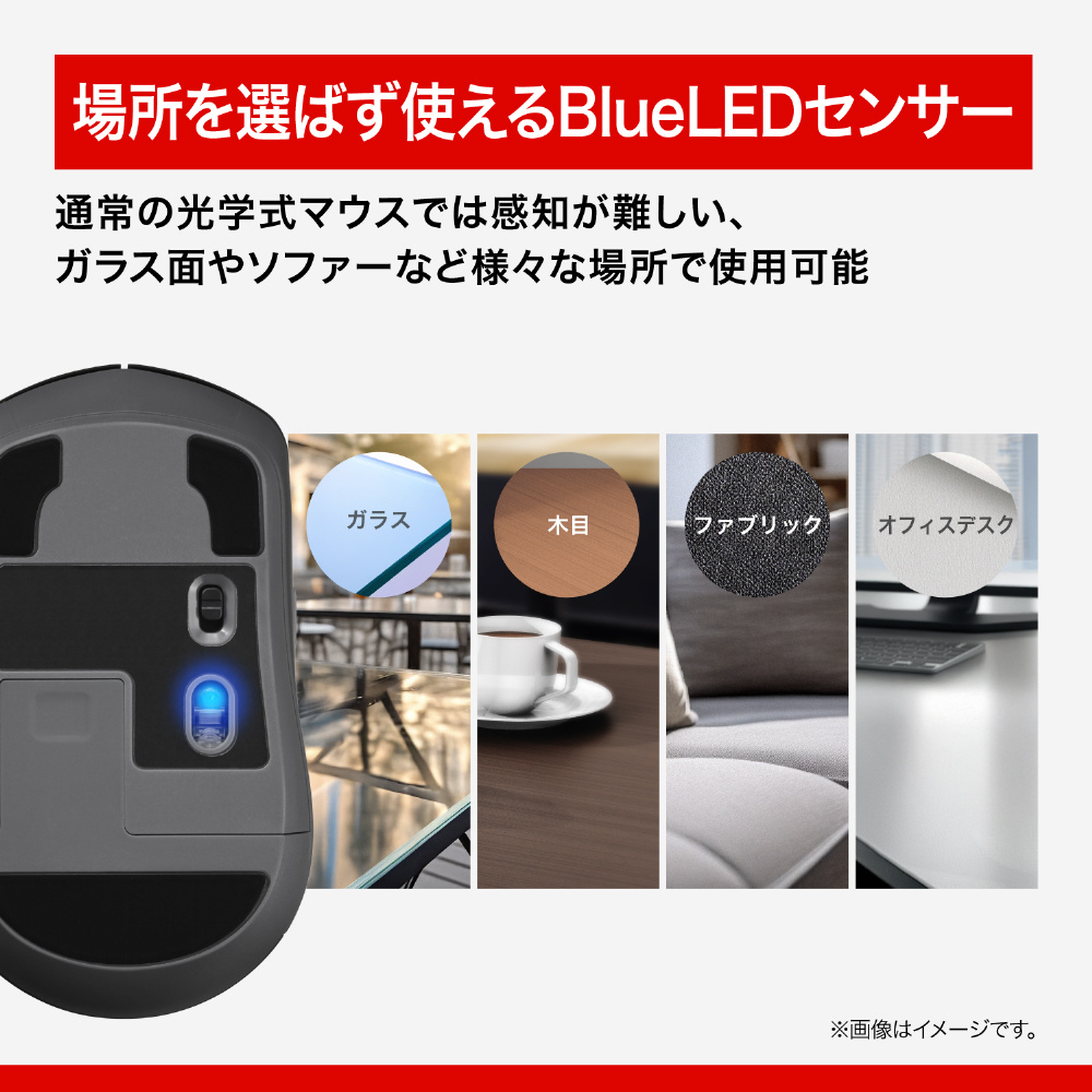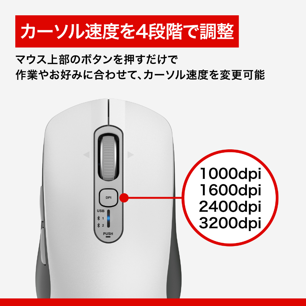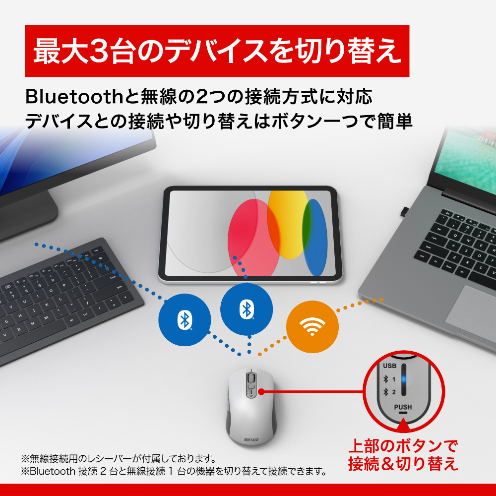 本商品は無線(2.4GHz)とBluetoothR接続の両方に対応しています。PCやタブレットなど機器に合わせて接続方法をえらべるため、複数のマウスを使い分ける必要がありません。