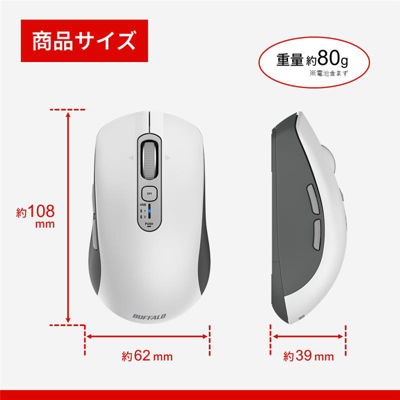 ※1日8時間のパソコン操作のうち5%をマウスに割り当てた場合。自然放電を考慮しないBUFFALO社計算値のため保証値ではありません。(使用環境・状況によって異なります)