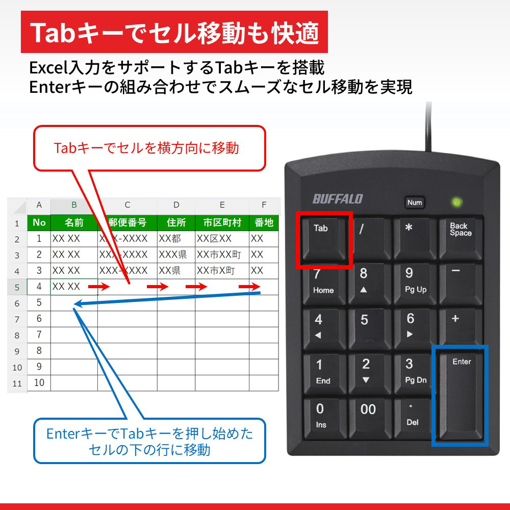 Excelのセル移動や関数選択がラクラクできる「Tabキー」を搭載。