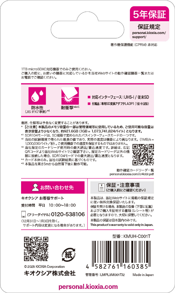 最大読み出し速度100MB/s最大書き込み速度90MB/sの1TB・microSDXC/SDHC UHS-1メモリカード