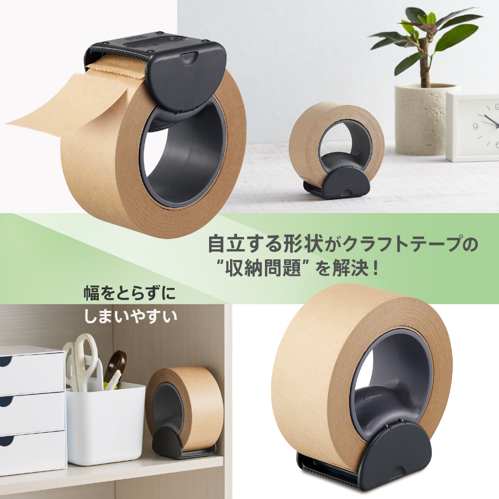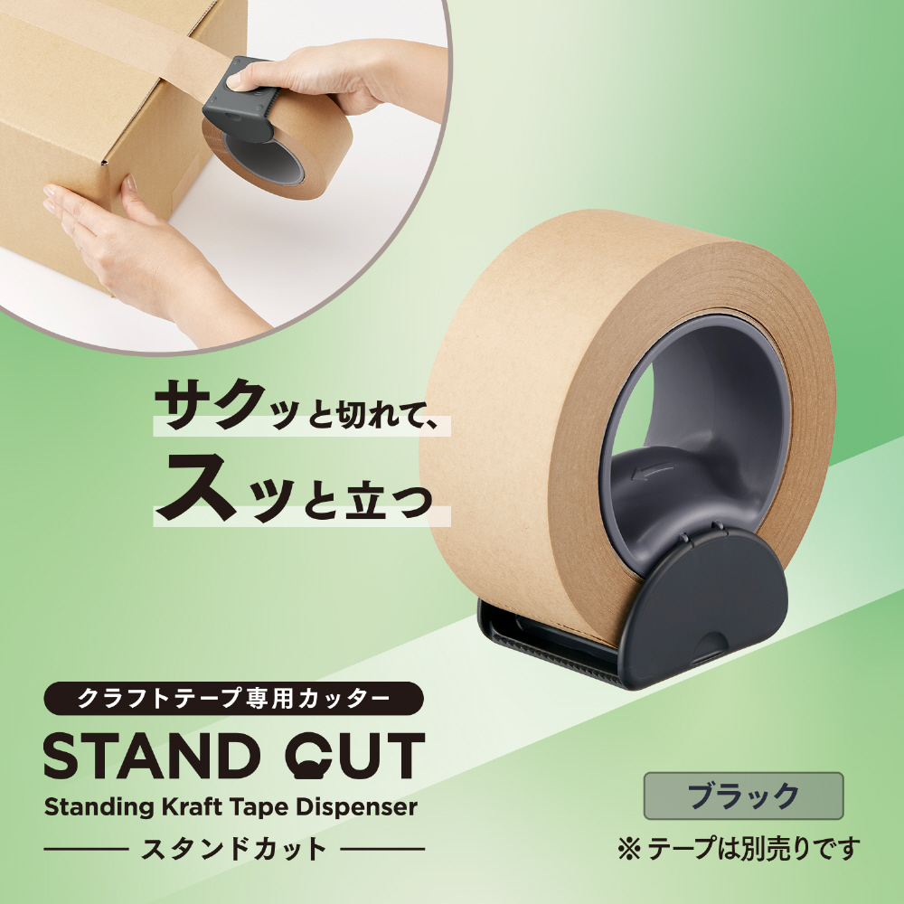 サクッと切れて、スッと立つ!自立してスマートに収納ボックスや棚に収納・保管できるクラフトテープ専用カッター。玄関やリビングなど生活空間になじむ落ち着いたカラーリングで、いつでもサッと手に取って使えます。