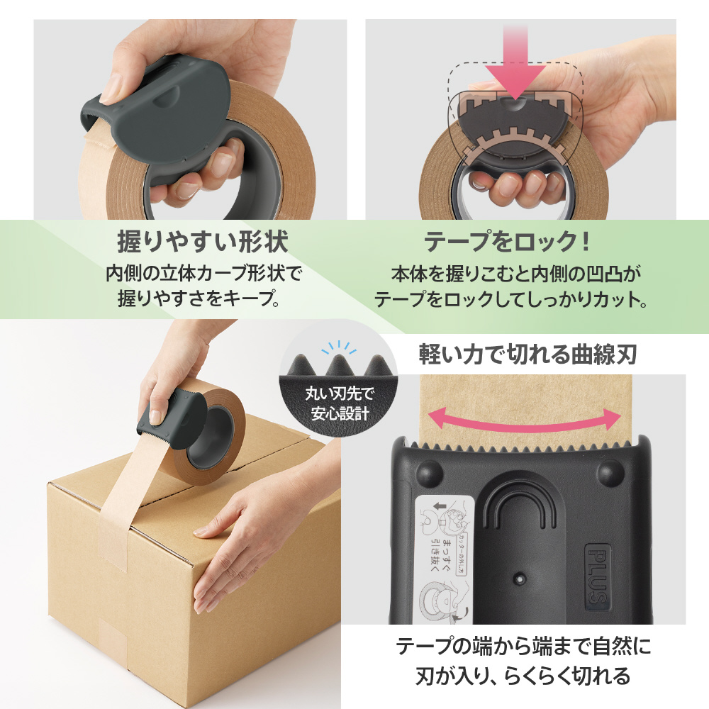 テープの残量にあわせて握る厚みを調整できる本体と、本体内側の立体カーブ形状で、テープの使い始めから終わりまで握りやすさをキープします。また、カット時に本体を握り込むと、内側の凹凸がテープをロックし、狙った位置でしっかりとカットできます。