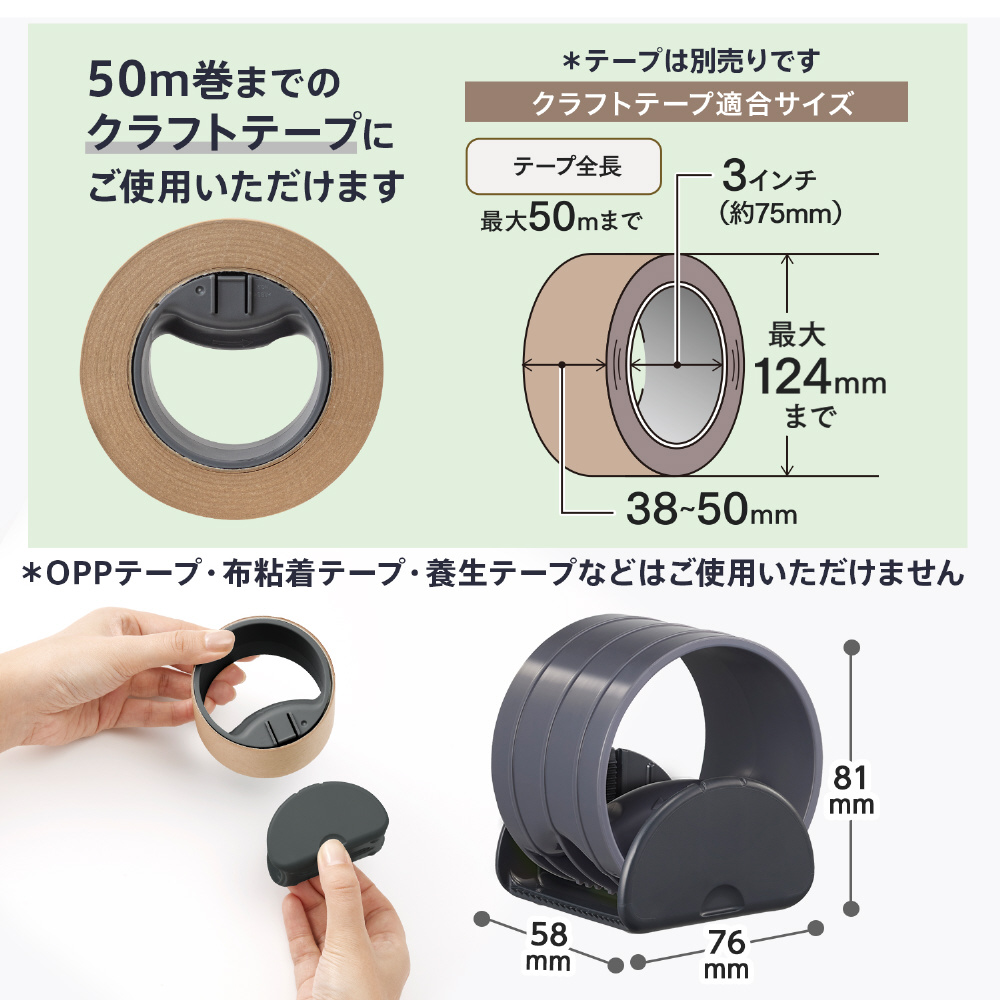 ・ープ適合サイズ:テープ幅 = 38~50mm、テープ外径 = 最大124mmまで、テープ芯内径 = 最大3インチ (約75mm)
