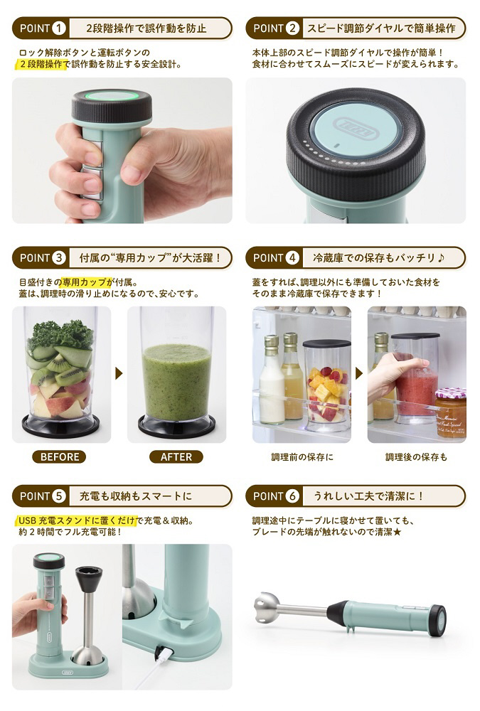 USB充電式のToffyコードレスハンドブレンダー。コードレスだから、コンセントの場所やコードのわずらわしさを気にせず使えます。キッチンや食卓など、場所を選ばず使えて快適!