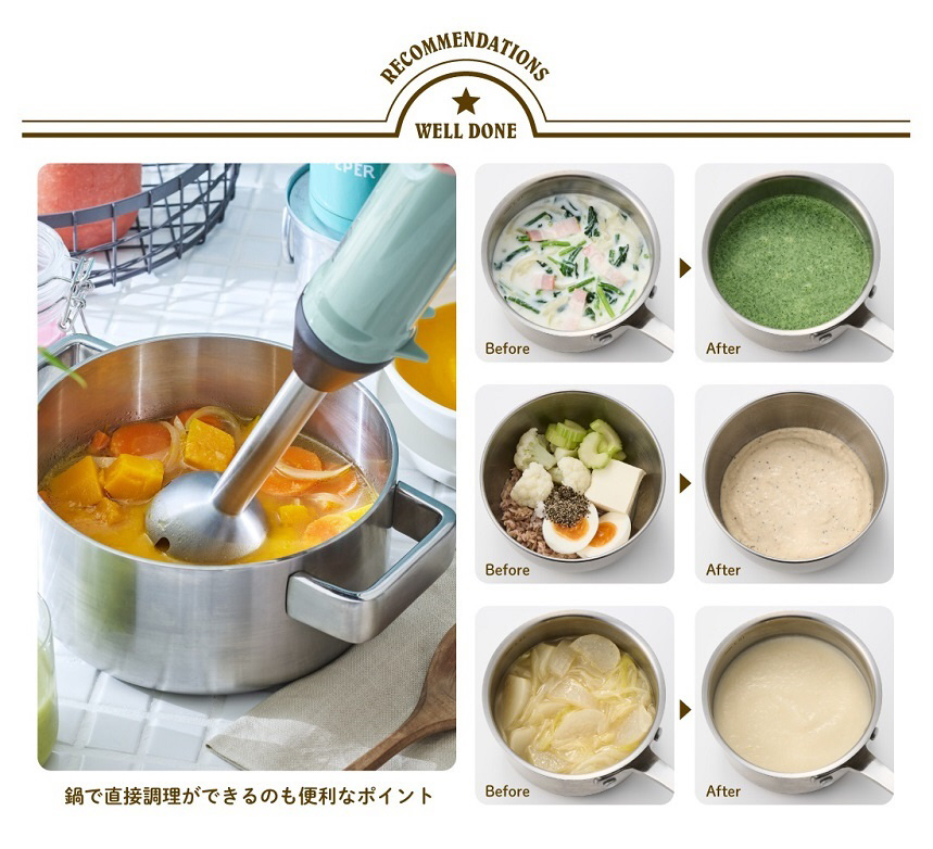 1 台で「つぶす」「まぜる」の2 役を使い分けて、いつもの料理をスピーディーに、手のかかる料理も簡単に作れます!