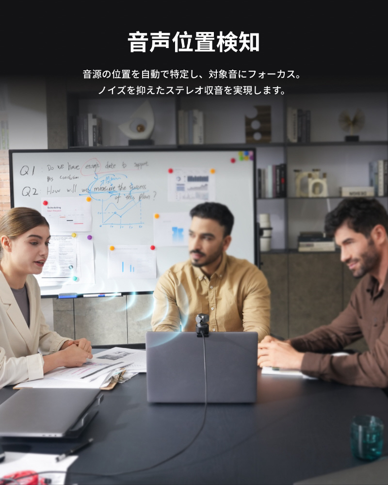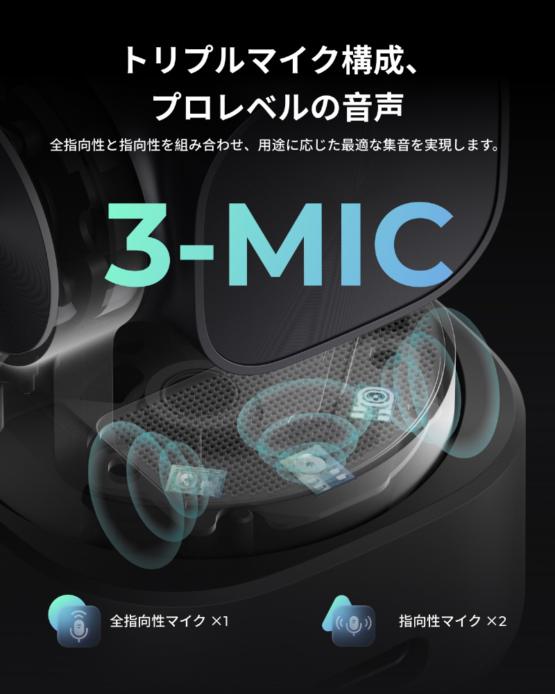 【トリプルマイク搭載、プロレベルの音質】OBSBOT web カメラには全体の音を捉える全指向性マイクに加え、声を正確に拾う2基のMEMS指向性マイクを搭載。5種類の専用オーディオモードにより、強力なノイズ低減とクリアな音声を実現し、環境に応じて最適な音質へ自動適応します。