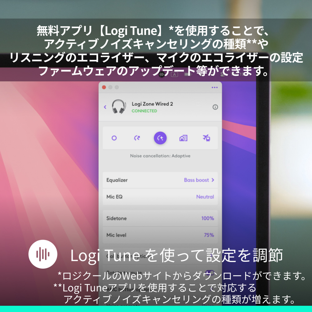 専用アプリ「Logi Tune*」を使用すれば、好みに合った音質の微調整やマイク感度の調整などのオーディオ設定に加え、ファームウェアの更新も簡単に実行可能です。別途使用しているウェブカメラ、マウス、キーボードなどの対応ロジクール製デバイスとともにカスタマイズすることで、生産性が向上します。
