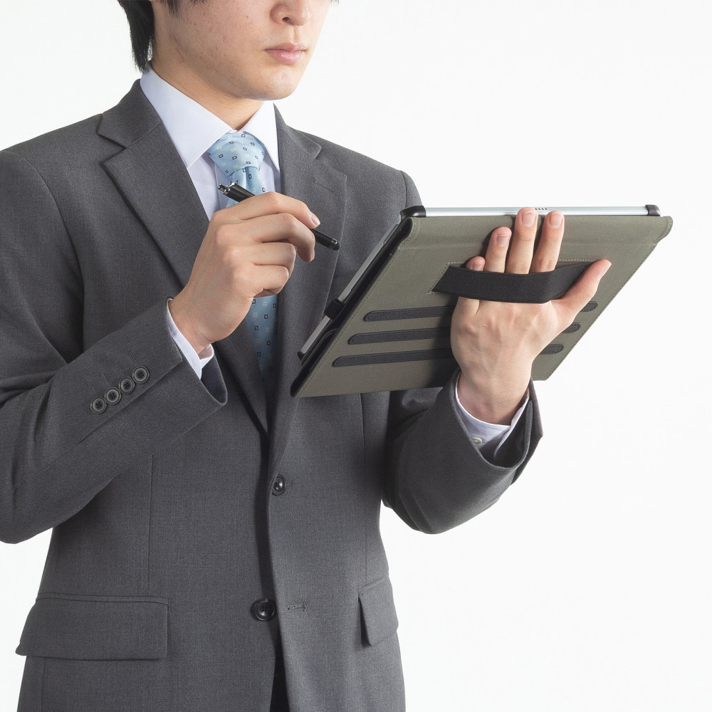 Microsoft Surface Pro 12インチ用ハンドベルト・ペンホルダー付き手帳型保護ケース。
