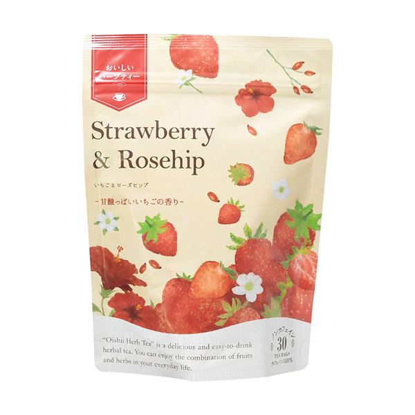 ローズヒップとハイビスカス配合の甘さと酸味のバランスがちょうどよい、いちごの香りのハーブティー。