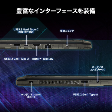 インターフェイス 有線LAN 1Gbps ×1、USB3.2 Gen1 Type-C(映像出力対応)×1、USB3.2 Gen1 Type-A ×2、HDMI ×1、オーディオコンボジャック ×1