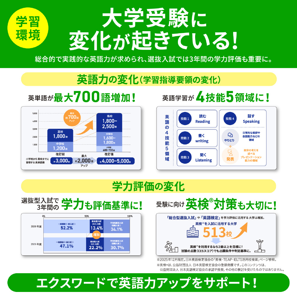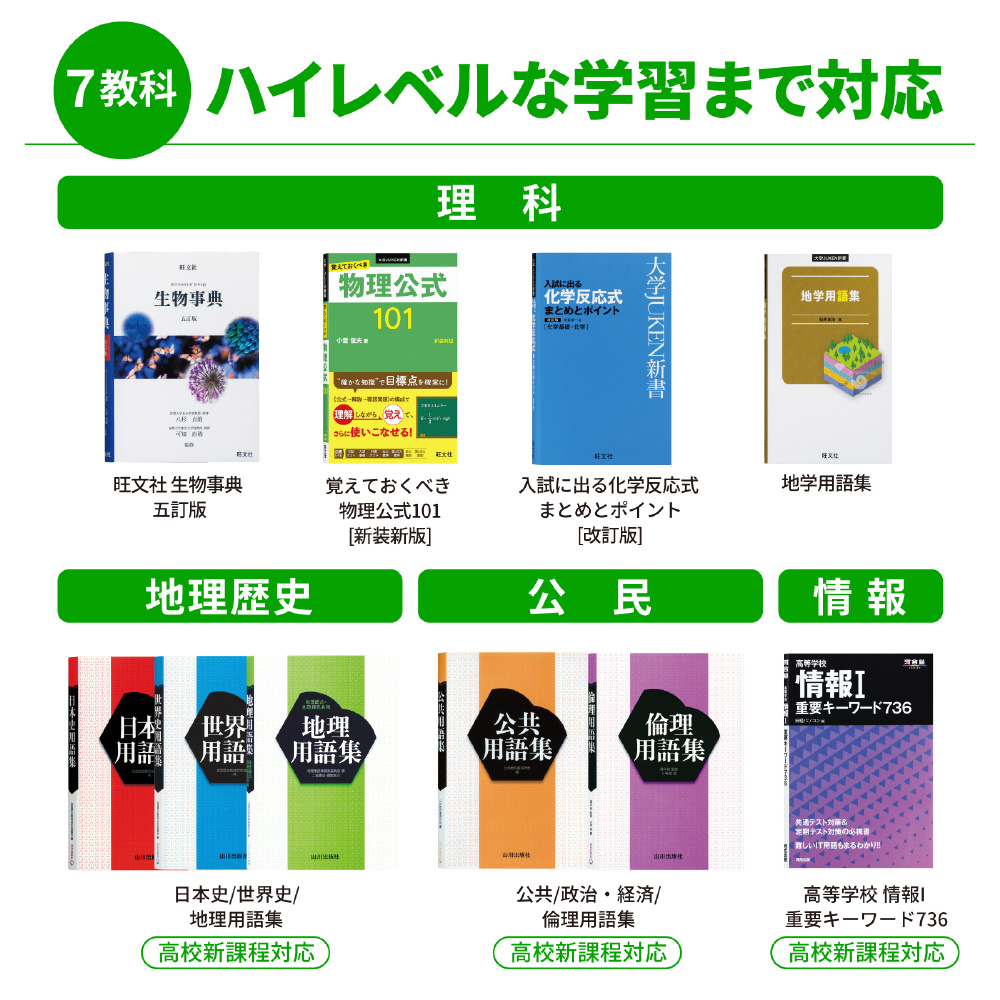 さらなる高みを目指す高校生へ。ハイレベルな英語学習、難関大学合格に向けた高校学習をサポート。 読む、聞く、書く、話すの4技能をバランスよく学習できる英語系コンテンツをはじめ、用語集、参考書、問題集などを幅広く収録。授業の予習・復習から受験まで活用できます。