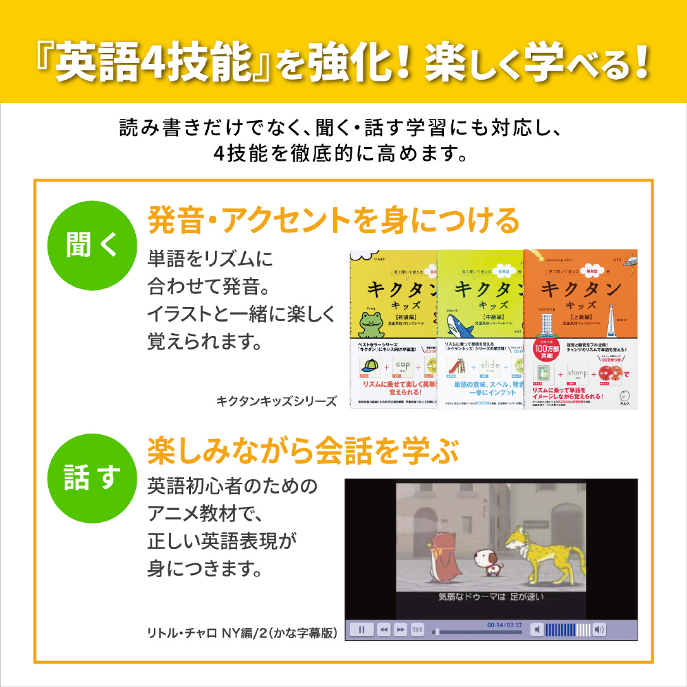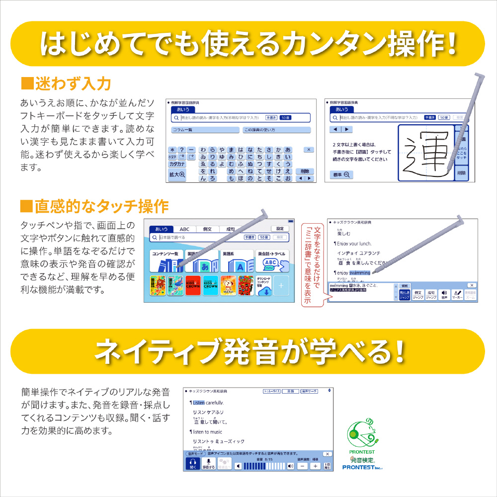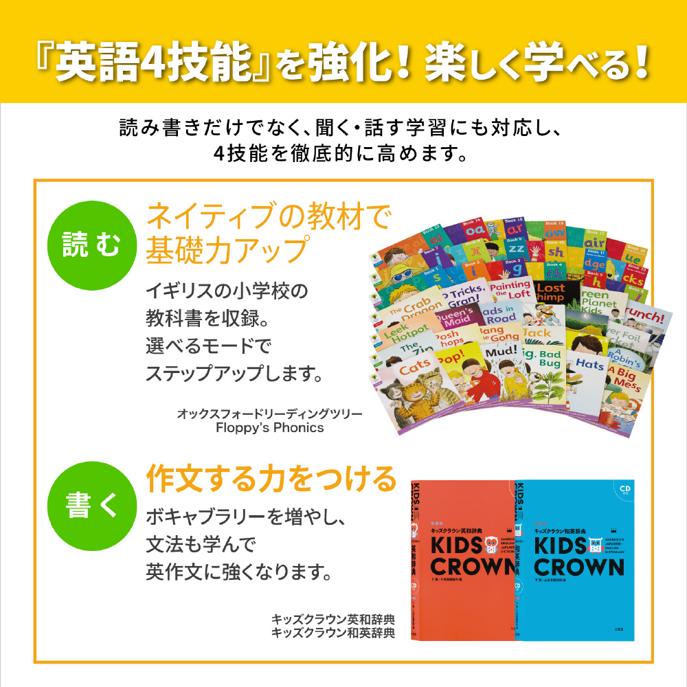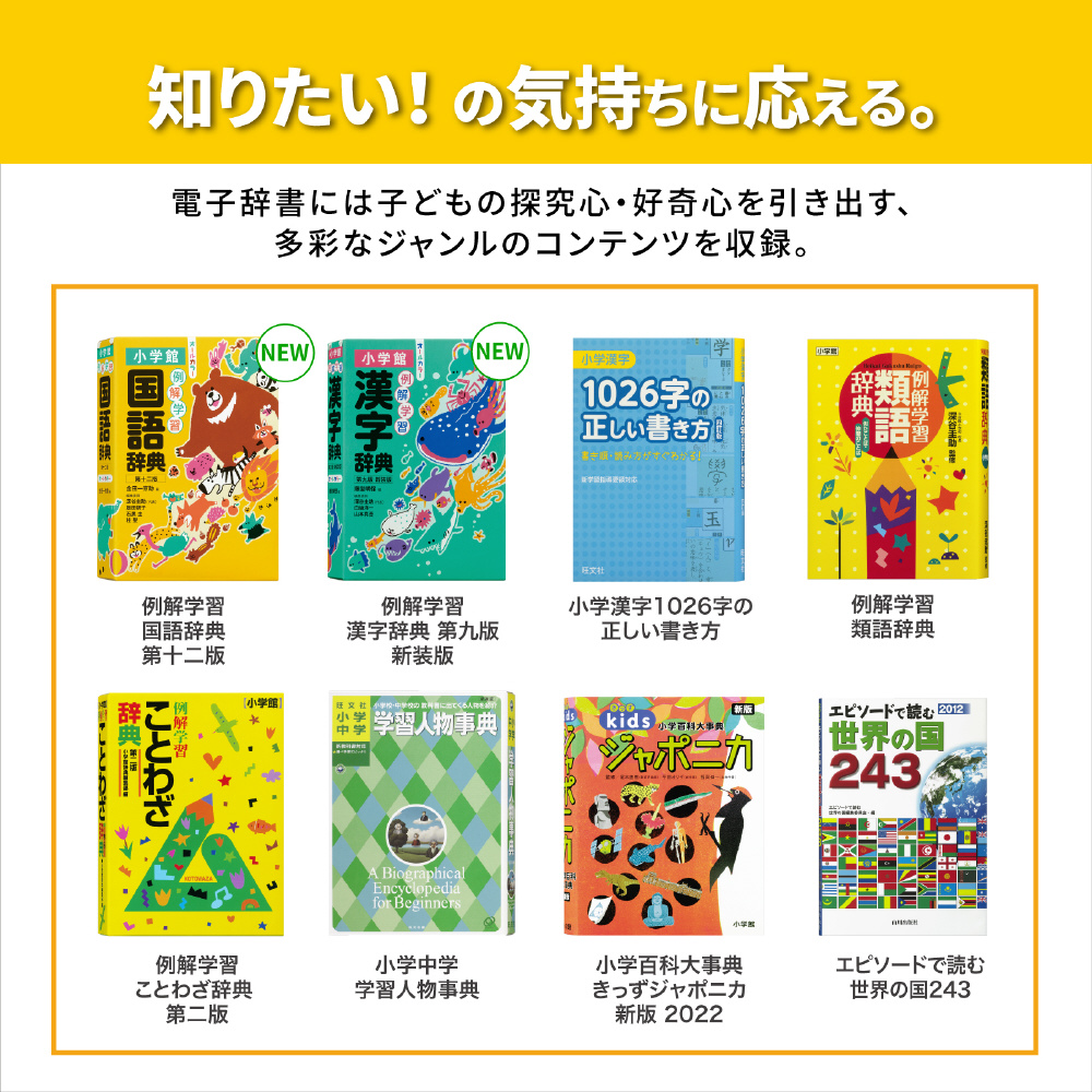 小学生の学習をしっかりサポートできる辞書や百科事典などを収録。読み仮名つきで読みやすい辞書や、イラストやアニメで楽しみながら学べるコンテンツなど小学生の学習レベルに合ったコンテンツが豊富でお子様の学習意欲を育てます。