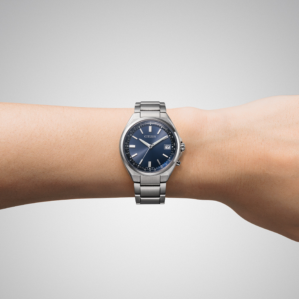 ■ケースとバンドにスーパーチタニウムを採用した、ベーシックな3針タイプのエコ・ドライブ電波時計。手首が細めの方にもフィットしやすい37.5mmケースです。