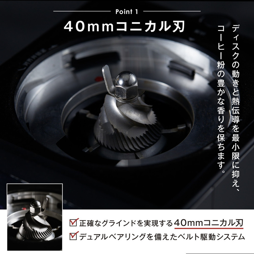デュアルベアリングを備えたベルト駆動システムがディスクの動きと熱伝導を最小限に抑え、コーヒー粉の豊かな香りを保ちます。