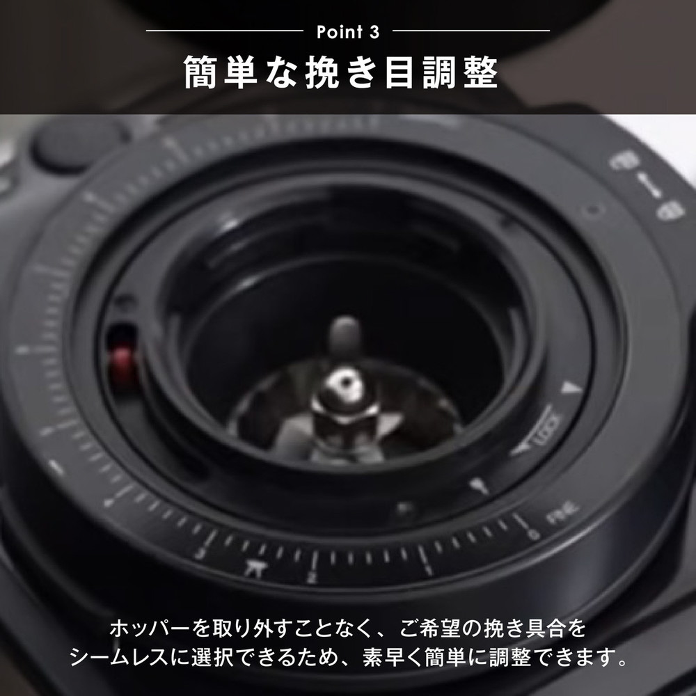 ホッパーを取り外すことなく、ご希望の挽き具合をシームレスに選択できるため、素早く簡単に調整できます。