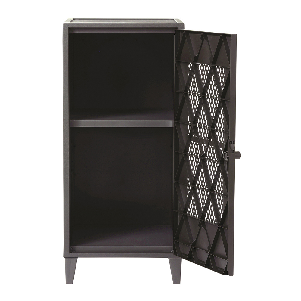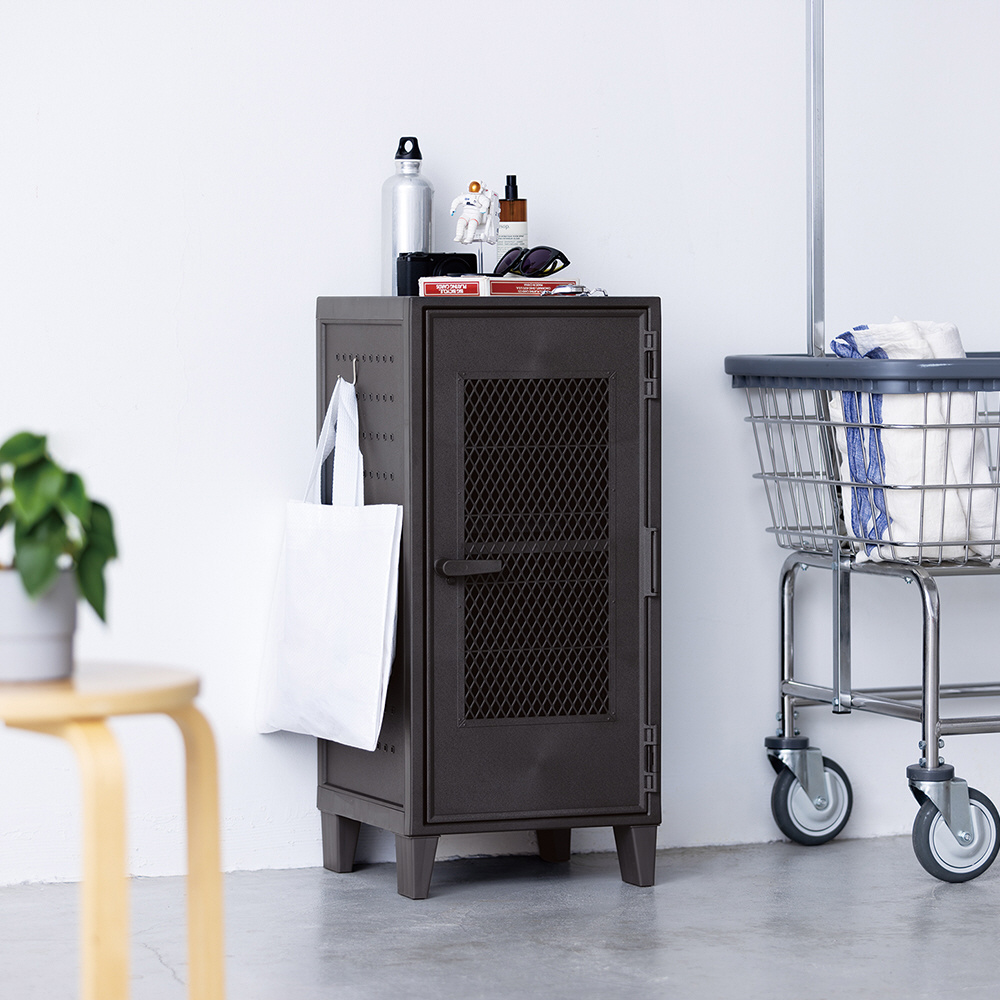 自由にアレンジできる側面にペグボードが付いたプラスチック製のロッカー型収納ケースです。