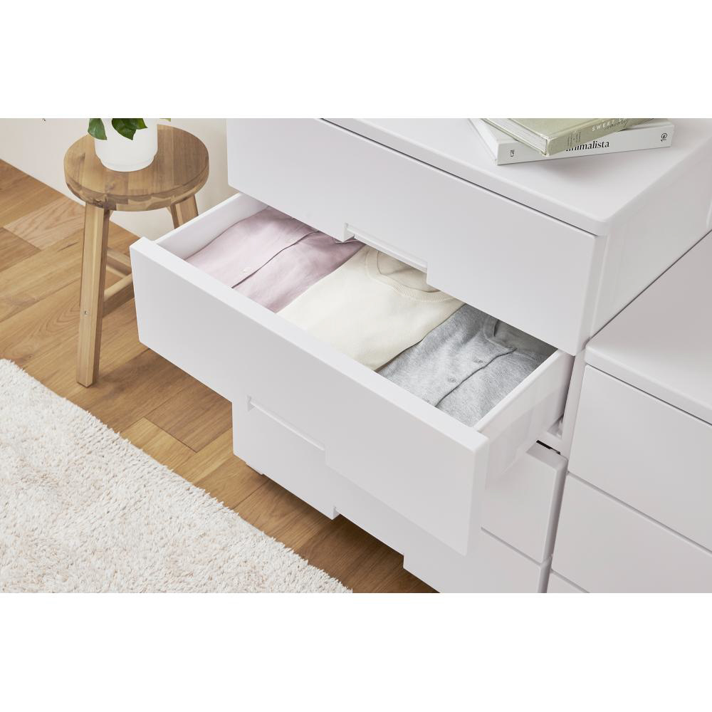【素材・材質】引出し・外枠・ロック・脚/再生ポリプロピレン(再生材比率10%以上)、ローラー/ポリプロピレン、すべり止め/ポリエチレン、前パネル/スチロール樹脂、天板/プリント化粧木質繊維板
