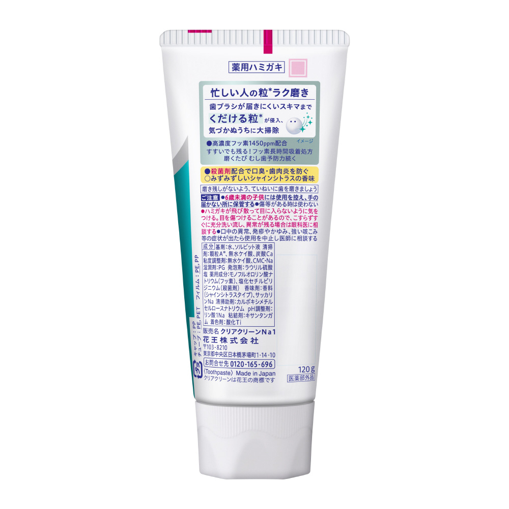 忙しい人の粒*ラク磨き。歯ブラシが届きにくいスキマまでくだける粒*が侵入、気づかぬうちに大掃除!・高濃度フッ素1450ppm配合/すすいでも残る!フッ素長時間吸着処方/磨くたびむし歯予防力続く・殺菌剤(塩化セチルピリジニウム)配合で口臭、歯肉炎を防ぐ。みずみずしいシャインシトラスの香味(医薬部外品)*清掃剤顆粒A