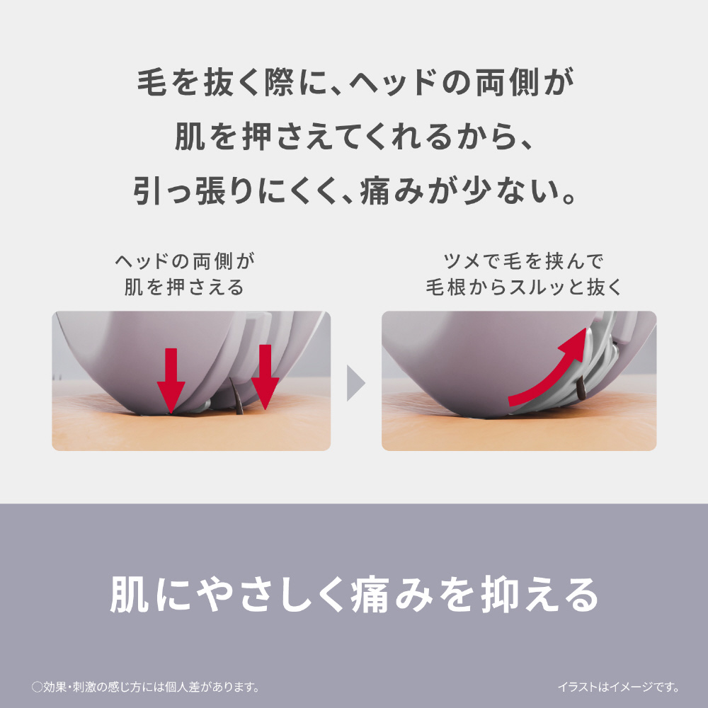 ・毛を抜く際に、ヘッドの両側が肌を押さえてくれるから、引っ張りにくく、痛みが少ない。