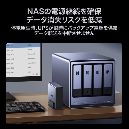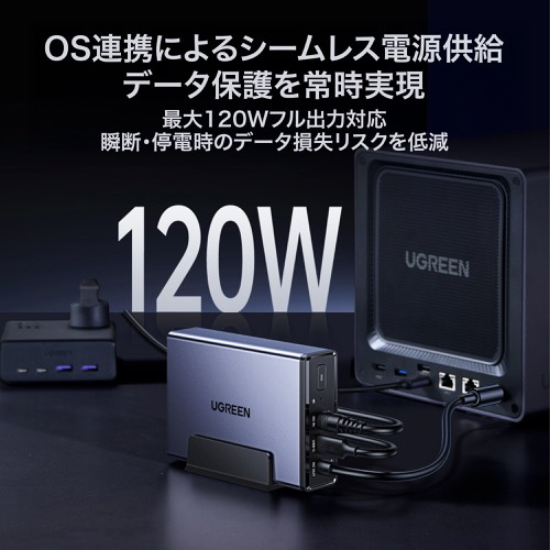 停電時に即座に起動し、NASへ120Wの安定した出力を供給。突然の電源切断によるデータ損失やファイルシステム破損を防ぎます。