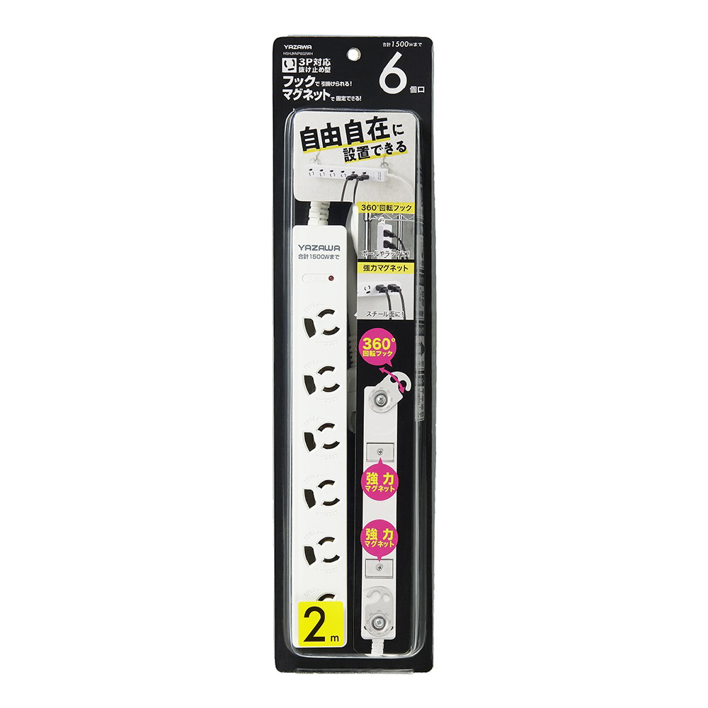 3P抜け止めマグネットフック付タップ6個口2m 白 H5HJKNP602WH 360°回転フック・強力マグネット・雷ガード機能付き 3Pプラグ対応 [2.0m /6個口 /スイッチ無]