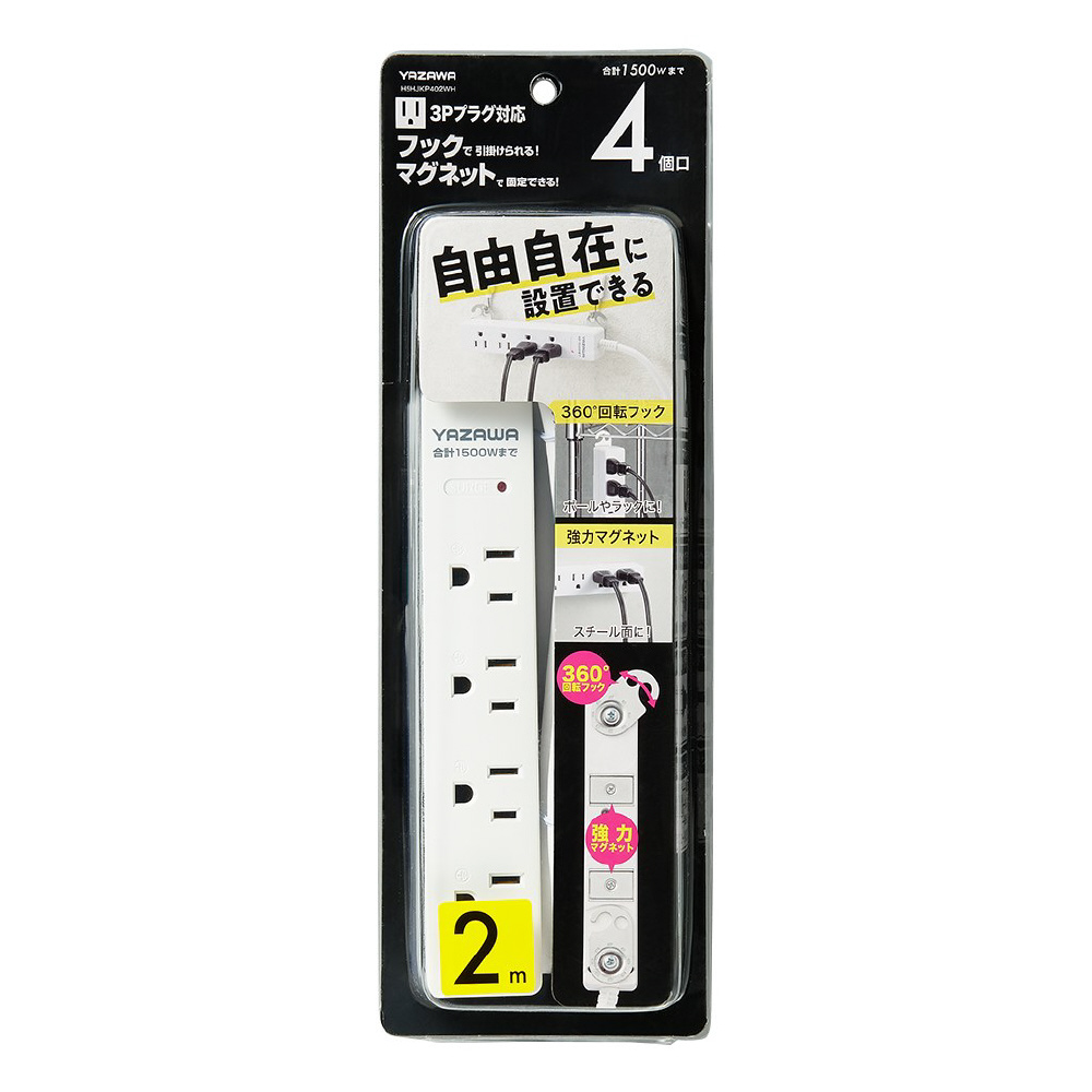 3Pマグネットフック付タップ4個口2m 白 H5HJKP402WH 360°回転フック・強力マグネット・雷ガード機能付き 3Pプラグ対応 [2.0m /4個口 /スイッチ無]