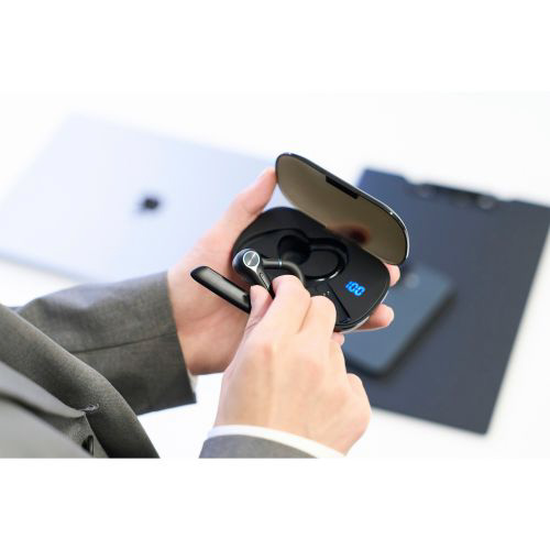 オンラインコミュニケーションをどこでもサポート!周囲の騒音をカットし、クリアな音声で会話を届ける片耳ワイヤレスヘッドセットです。充電ケース付きで、外出先や移動中でも充電切れの心配なく、長時間の会議や商談にも安心して使えます。