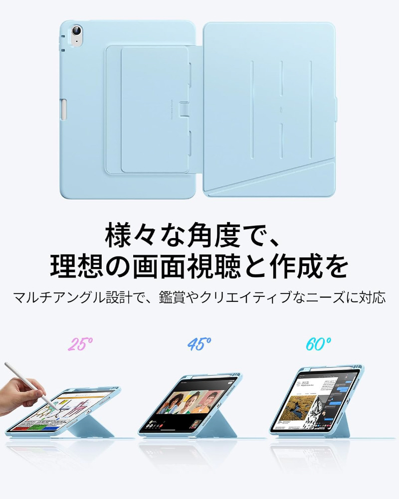 2つのスタンドモードに対応しており、45°〜60°はビデオ鑑賞、作業、FaceTimingなどに最適なビューイングモードへと、25°に調節した場合は執筆、絵画、その他のクリエイティブな作業に最適なライティングモードへと用途に合わせて角度調節が行えます
