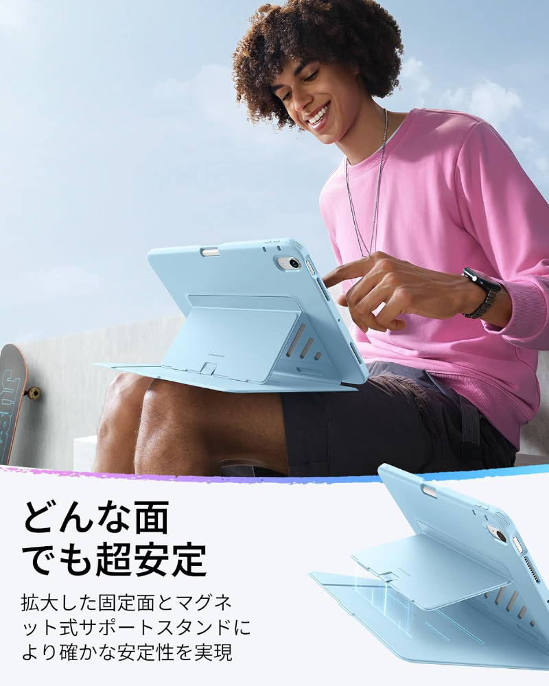 幅広いカバーと強力なマグネットブラケットで設計された当ケースは、ソファ、ベッド、手、膝の上など、どのような表面でも安定し、滑ることなく安定性を保ちます