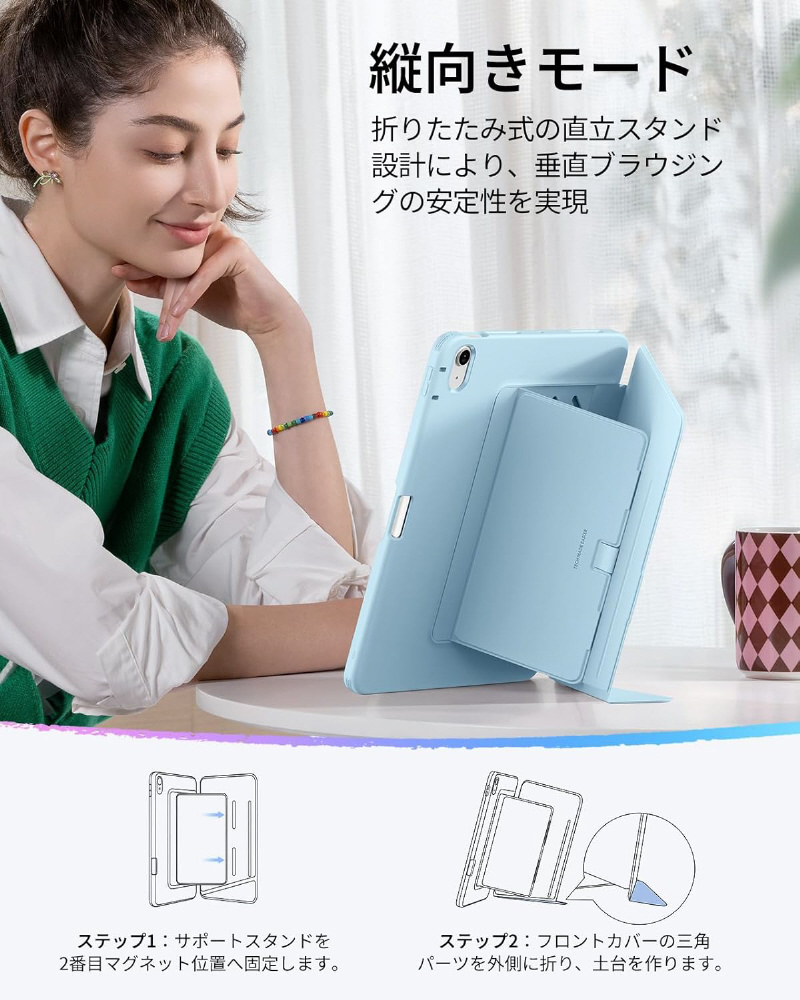 3段階調節可能な横向きモードと、独自開発の「三角ダブルロック構造」を採用した縦向きモードを備えています。動画視聴からSNS閲覧まで、磁石スタンドサポートによる固定デザインにより、確かな安定性を実現します。縦向き利用時は2番目のマグネット位置へ固定し、フロントカバーの小さな三角パーツを外側に折ることでしっかりと自立します(内側に広げて使用しないでください)。