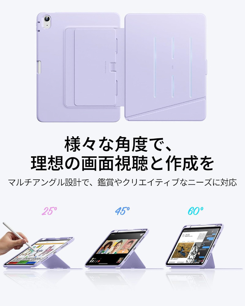 2つのスタンドモードに対応しており、45°〜60°はビデオ鑑賞、作業、FaceTimingなどに最適なビューイングモードへと、25°に調節した場合は執筆、絵画、その他のクリエイティブな作業に最適なライティングモードへと用途に合わせて角度調節が行えます