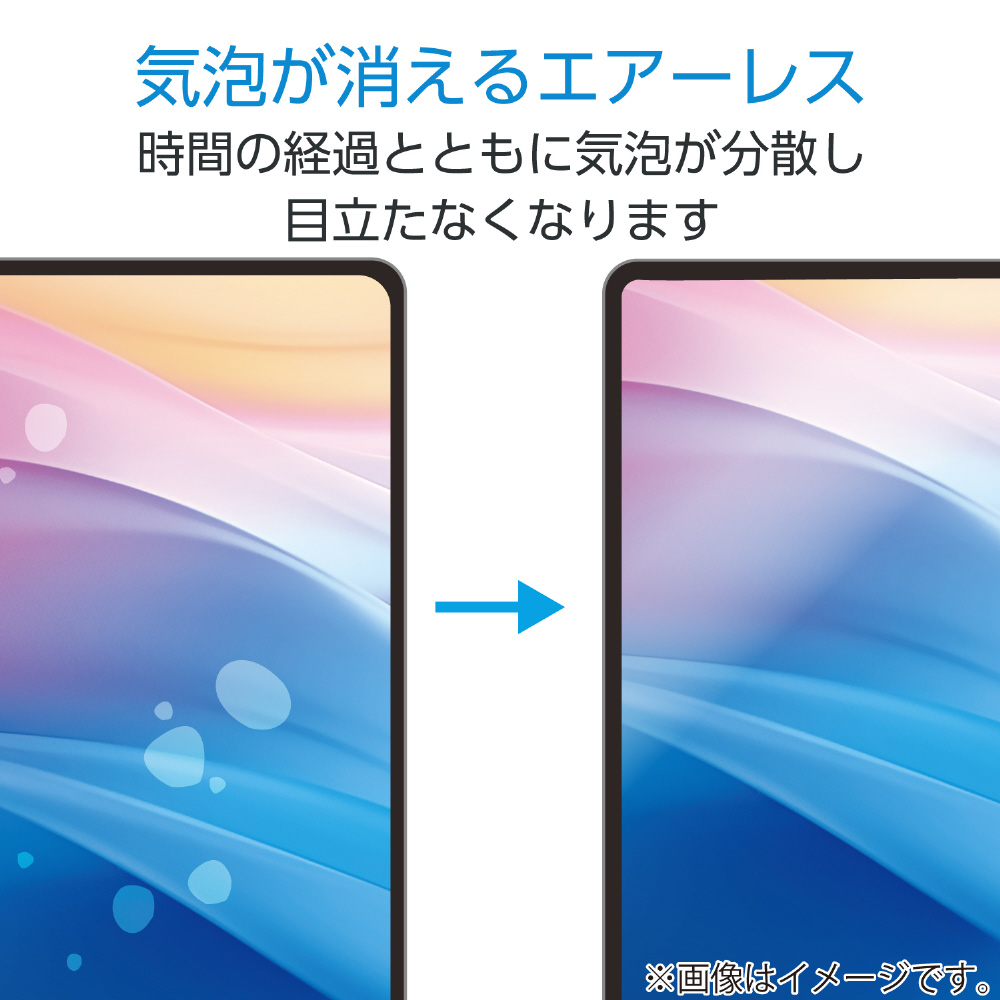 貼る際に気泡が入りにくく、入った場合でも時間の経過とともに気泡が分散され目立たなくなります。また、小さなホコリ等を吸収し画面に気泡が残りません。
