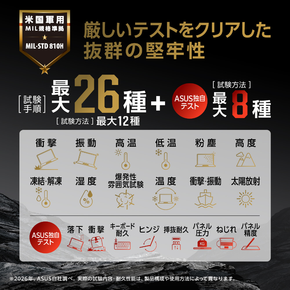 米国の軍用規格であるMIL規格(MIL-STD 810H)準拠の厳しいテストをクリアしているTUF Gaming。激しいゲームプレイ時や通勤・通学時など、日々の様々なシーンで安心して使用することができます。