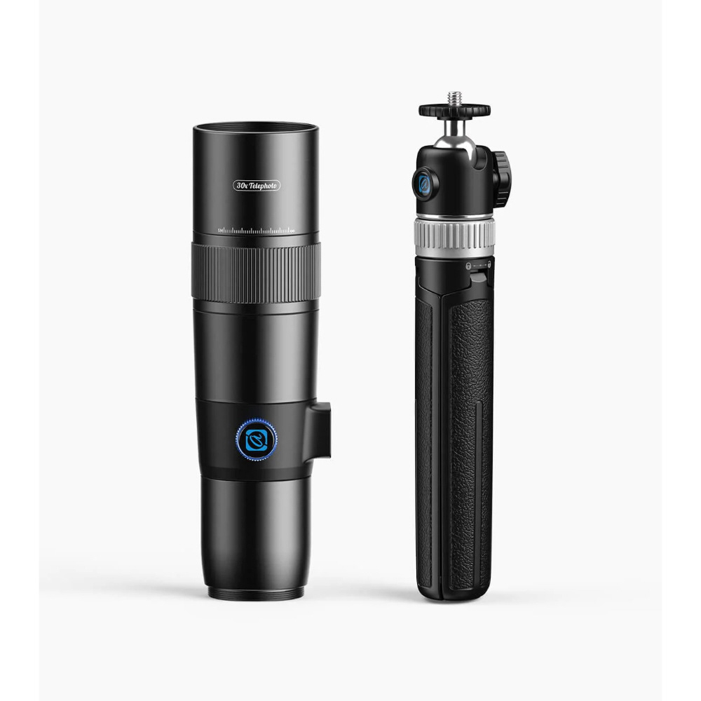 スマートフォンに取り付けて使用する30倍望遠レンズです。安定した撮影に役立つコンパクトな三脚が付属。また、付属のアイカップを取り付けて単眼鏡としても活用できます。