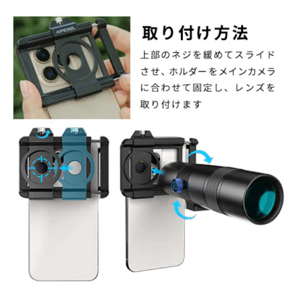スマホにクリップで挟み、レンズを装着するだけで、簡単に望遠撮影が始められます