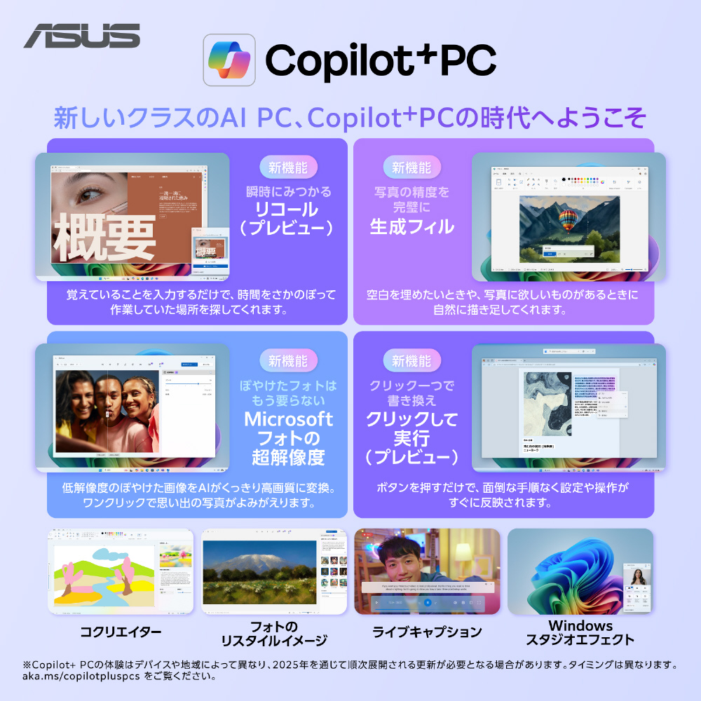 AI画像生成のコクリエイターや、リアルタイムで字幕を生成するライブキャプション、PC上で行われた操作やコンテンツを遡って検索できるリコールといったCopilot+ PC ならではの最新機能をすぐに利用可能です。AIを活用して、毎日をもっとスマートに。