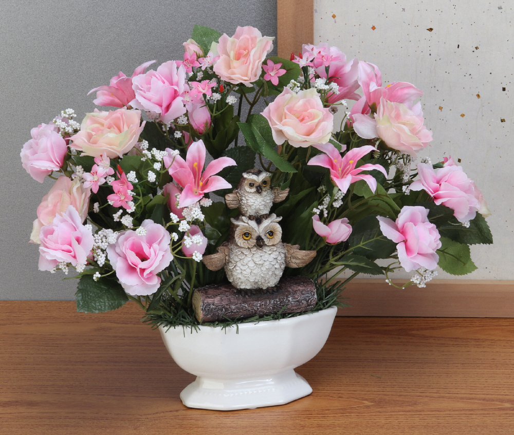 幸福のふくろうアレンジメントフラワー 光触媒加工 ピンク