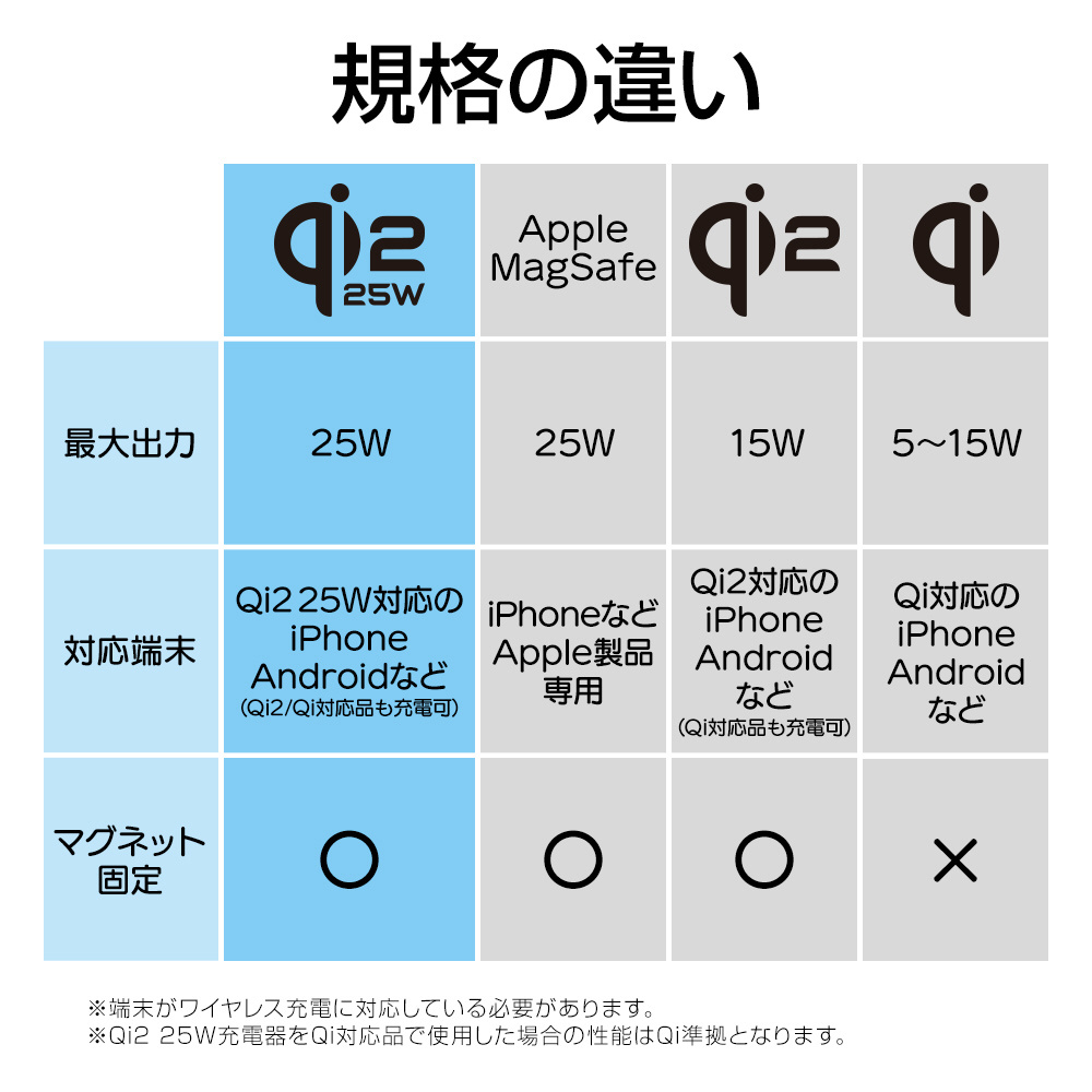 ●Qi2対応のスマートフォン、MagSafe対応のiPhoneの機器やケースにピタッと装着できるマグネットを内蔵しています。