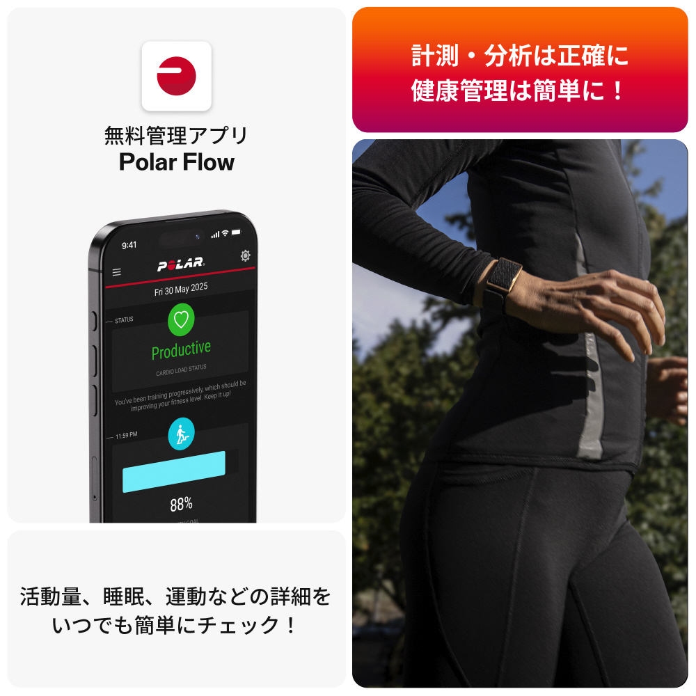 睡眠や活動量計測に特化した、ポラール初のヘルスケアバンド。画面のないリストバンド型で表示や通知を気にすることなく、自分の好きなタイミングで進捗をチェックできます。高精度心拍センサーを搭載。本体は軽量29.5gで就寝中も気にならずに計測可能。防水なので、家事やお風呂でも着用できます。