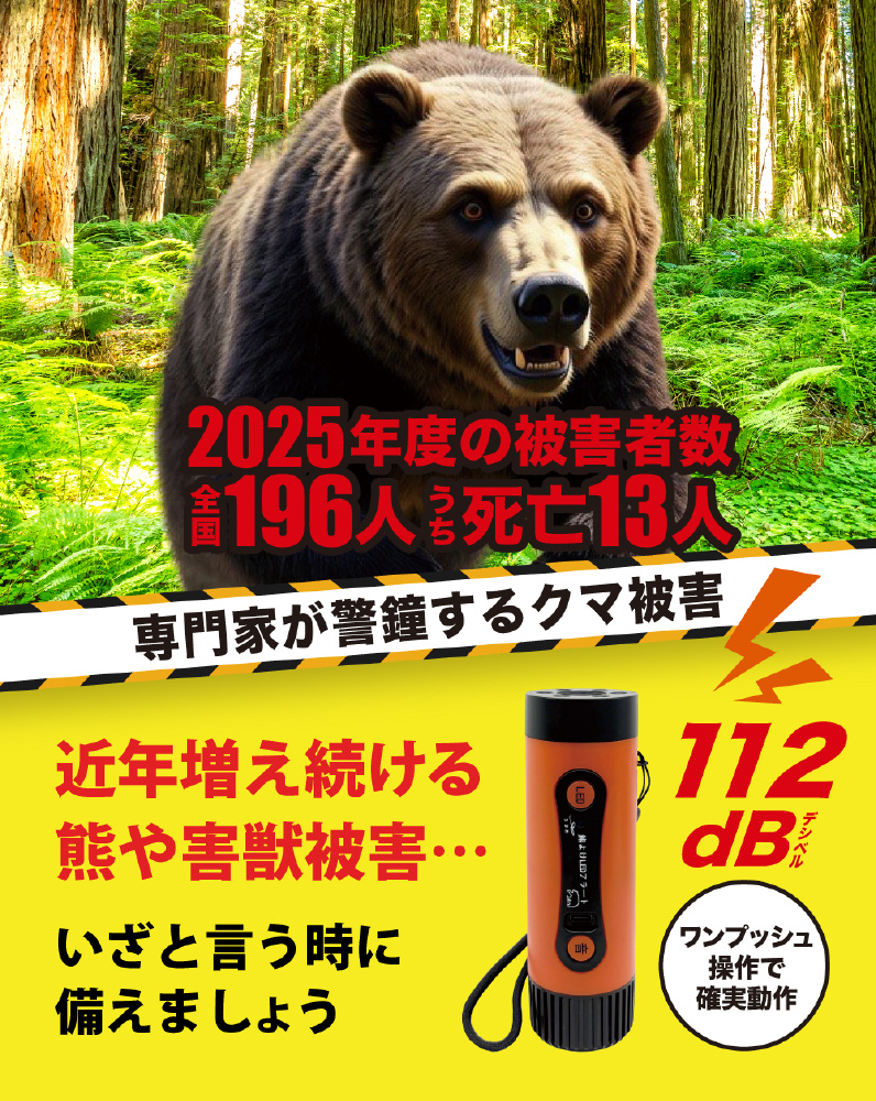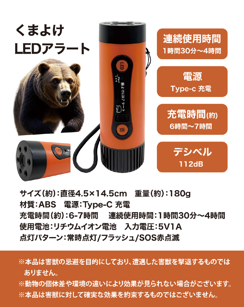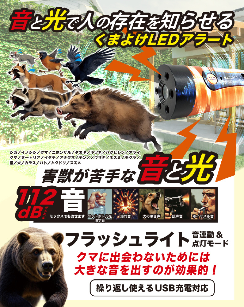 コンパクトで軽量、持ち運びやすく外出時に最適!犬の鳴き声や爆竹音など複数の音で熊にしっかり警告!LED付きのアラートです。