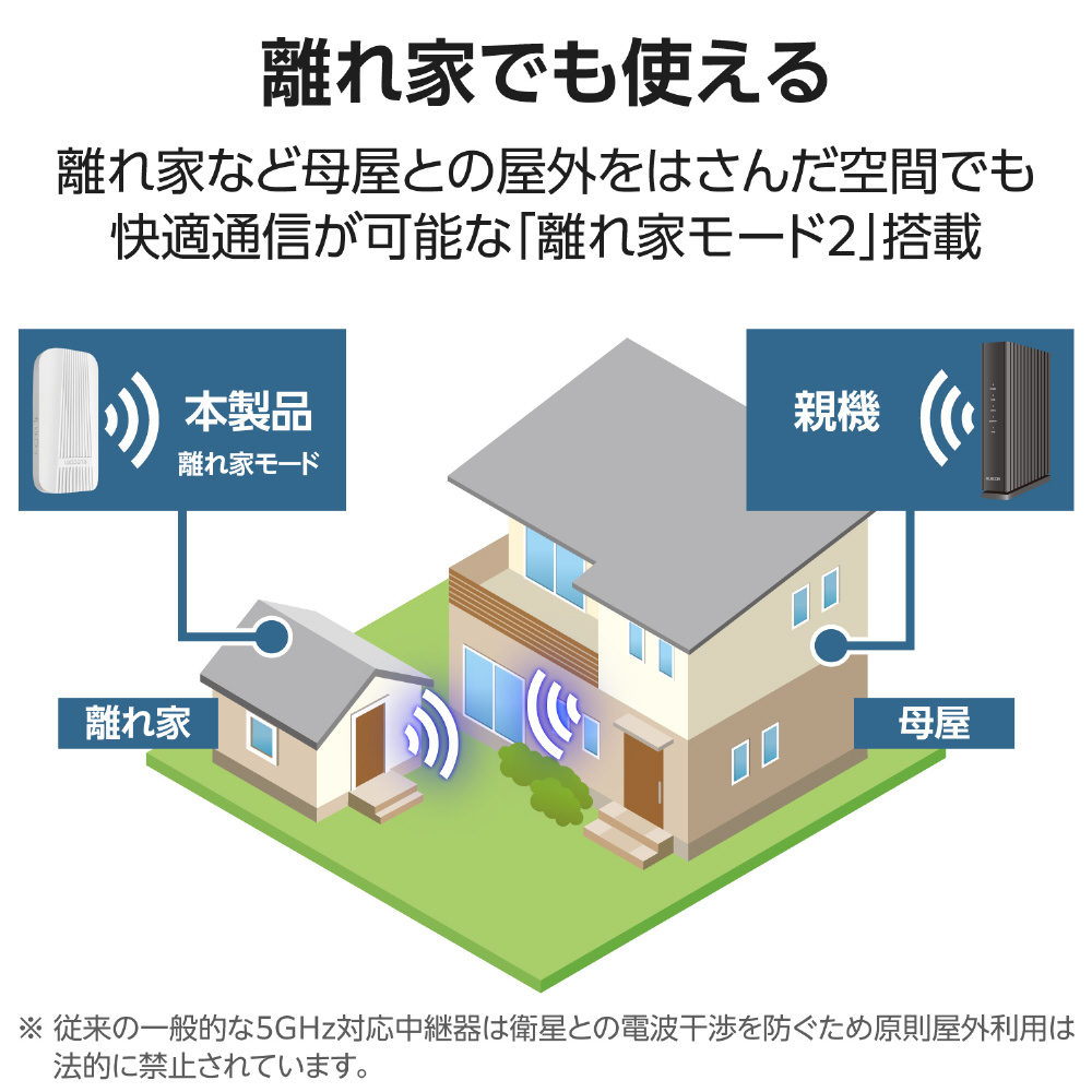法的に屋外利用が認められた帯域のみを利用し、ルーターと中継器の間の電波を中継する機能です。
