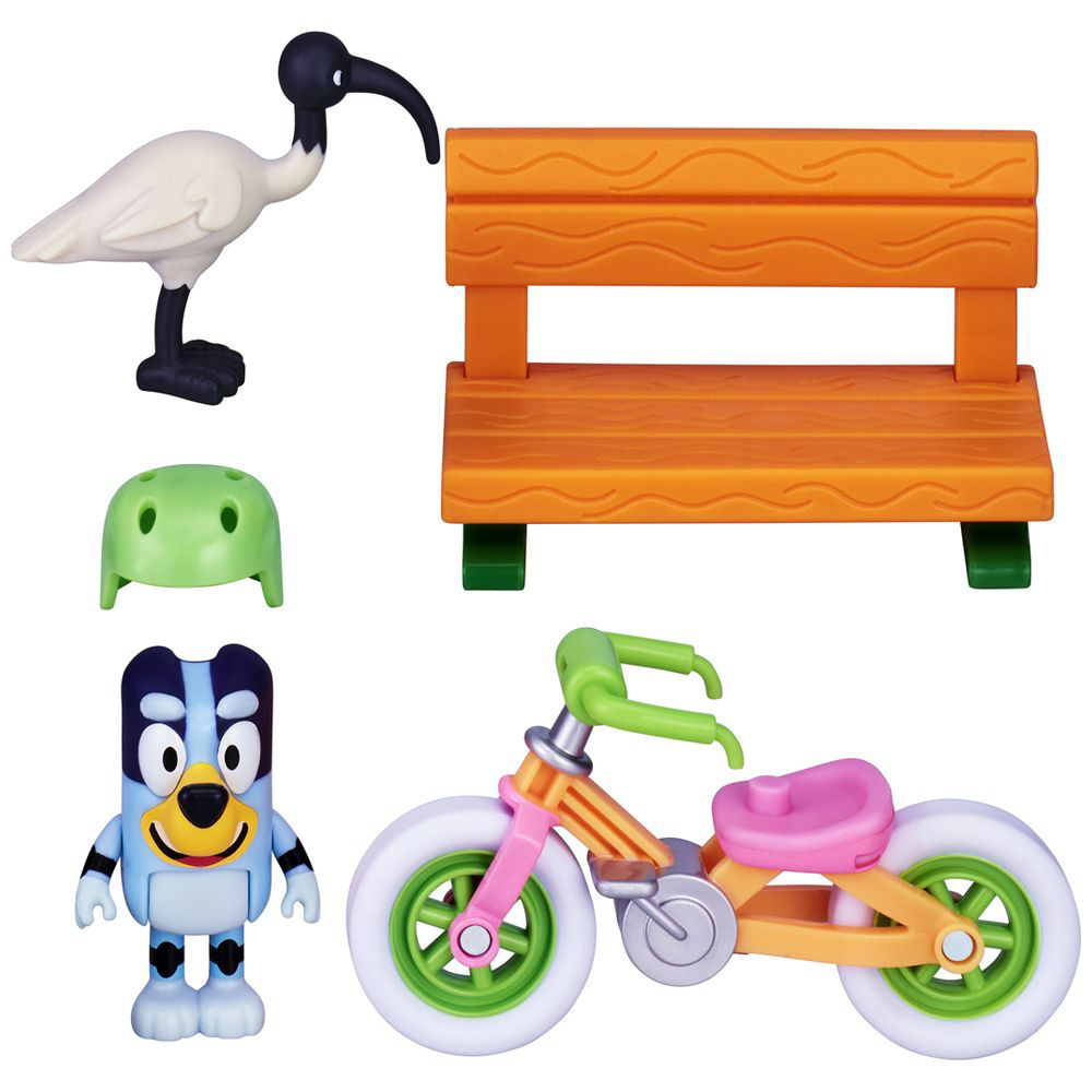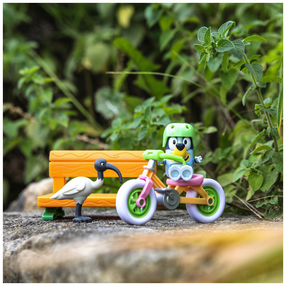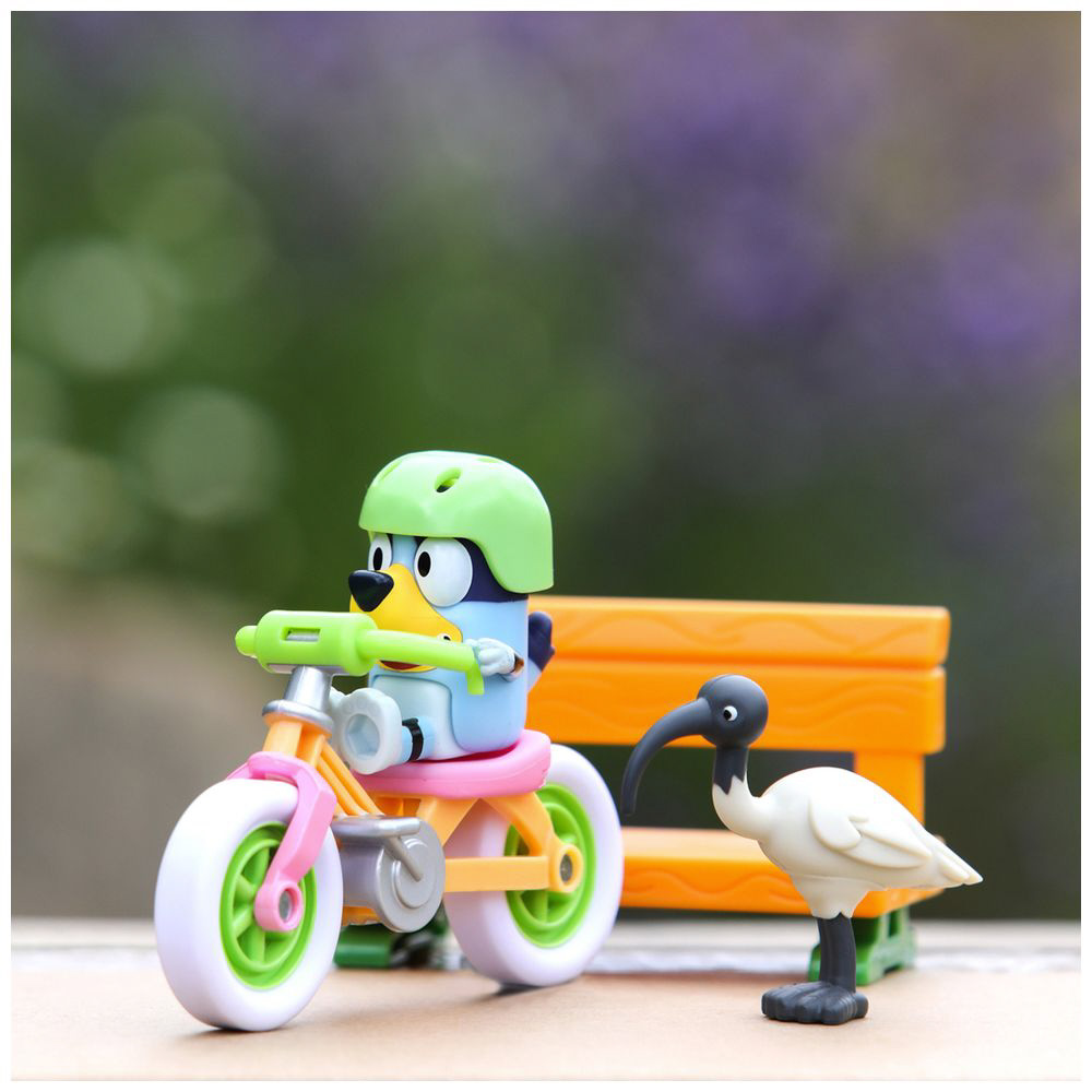 ブルーイのフィギュアとヘルメット、じてんしゃ、ベンチ、鳥がついています。