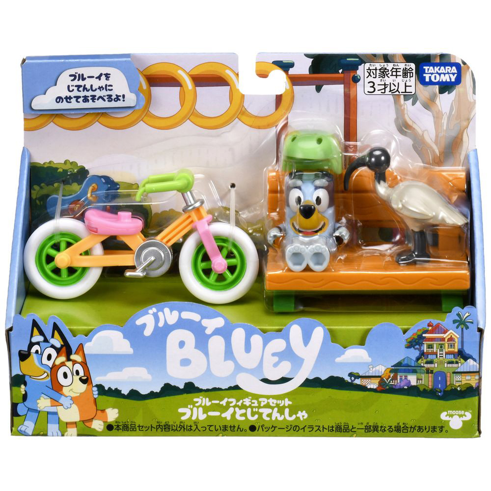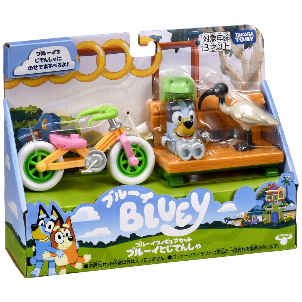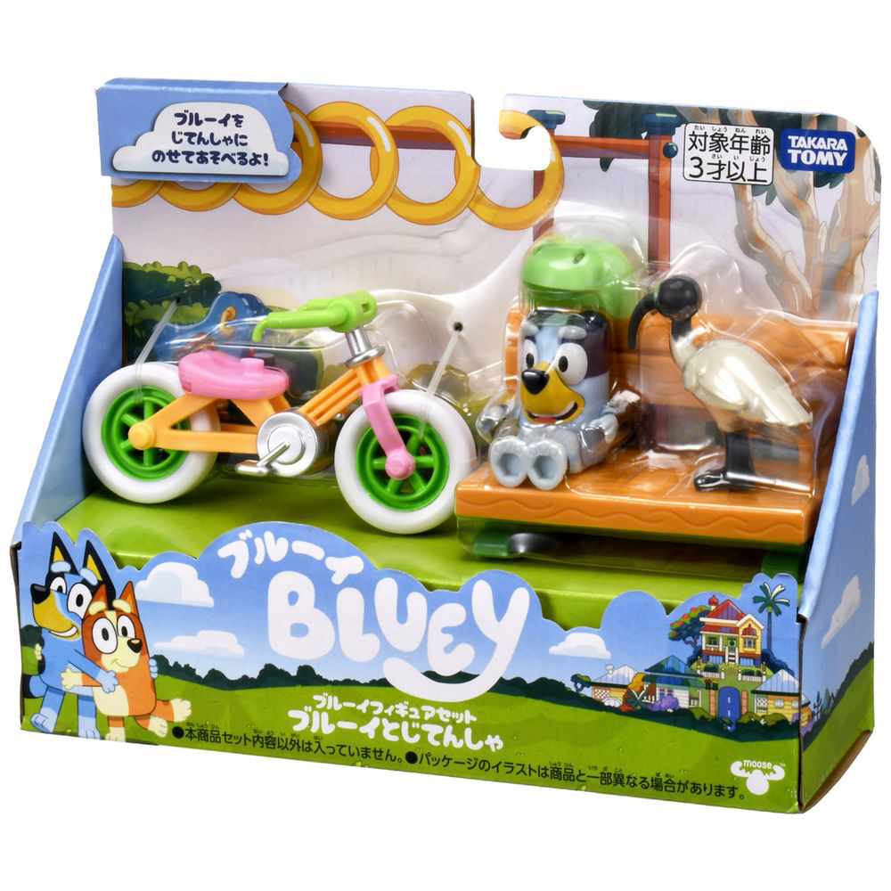 アニメのエピソード「じてんしゃにのろう」をイメージした、ブルーイのフィギュアとヘルメット・じてんしゃ・ベンチ・鳥のセットです。